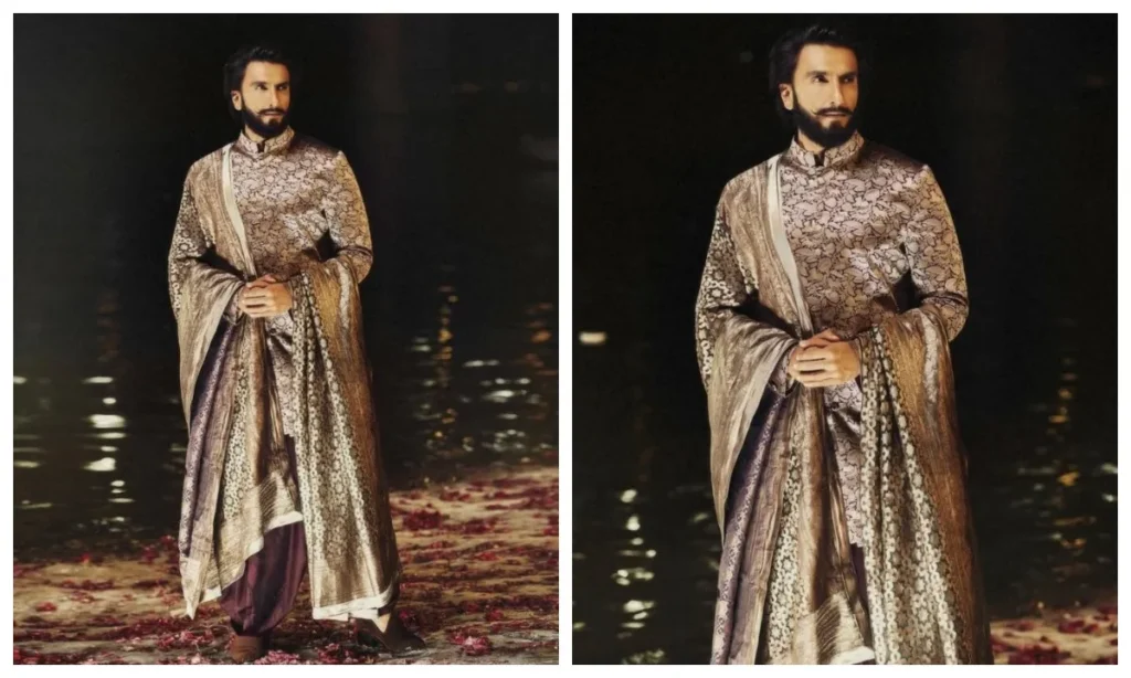 स्टाइल की बात हो और रणवीर सिंह का जिक्र ना हो, ये कैसे हो सकता है? अगर आप चाहते हैं कि जब आप एंट्री लें, तो सबकी नज़रें सिर्फ आप पर टिक जाएं, तो रणवीर का ये लुक आपके लिए है. मनीष मल्होत्रा की इस शेरवानी पर दबका वर्क का बारीकी से काम किया गया है. ये दिखने में भारी और बहुत शाइनी है. इस तरह की शेरवानी आपको हाई-वोल्टेज ड्रामा और रॉयल फील देगी.