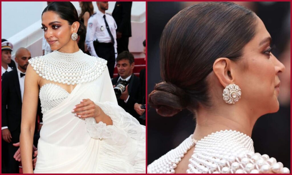 दीपिका पादुकोण का कान्स लुक काफी वायरल हुआ था. उन्होंने व्हाइट कलर की साड़ी को ट्यूब ब्लाउज के साथ पेयर किया. खूबसूरत पर्ल नेकलेस और डायमंड स्टड्स के साथ दीपिका ने इस साड़ी को स्टाइल किया.