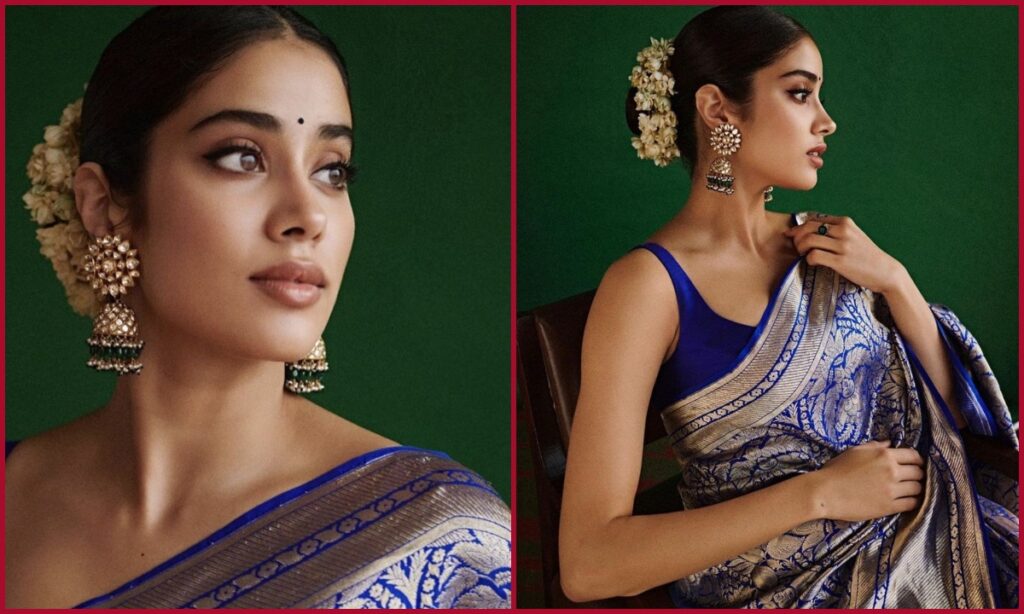 ट्रेडिशनल बनारसी साड़ी में जान्हवी कपूर का लुक देखने लायक है. इस रॉयल ब्लू कलर की साडी को उन्होंने मैचिंग स्लीवलेस ब्लाउज के साथ पहना. स्लीक हेयर बन और कुंदन झुमकी ने जान्हवी का रूप और निखारा.