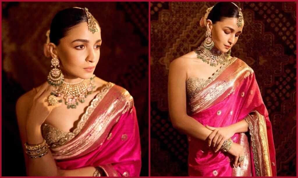 बॉलीवुड एक्ट्रेस आलिया भट्ट का ये पिंक साड़ी लुक किसी का भी दिल जीत सकता है. उन्होंने स्ट्रेपलेस ब्लाउज के साथ अपने साड़ी लुक को बोल्ड बनाया. खूबसूरत चांदबाली और मैचिंग हार के साथ आलिया ने अपना लुक कम्पलीट किया.