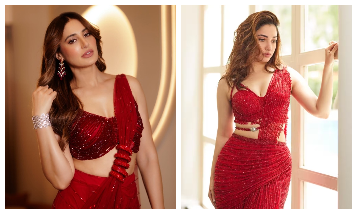 सेक्विन वर्क वाली इस लाल रंग की साड़ी में तमन्ना बेहद स्टाइलिश नजर आ रही हैं. इस प्रीड्रेप स्लिट कट साड़ी को उन्होंने मैचिंग डीप नेकलाइन डिजाइनर ब्लाउज, लाइट मेकअप और ओपन कर्ली हेयर स्टाइल के साथ कैरी किया. क्रिसमस पार्टी में अगर आप ऐसी साड़ी पहनेंगी तो बेहद हॉट दिखेंगी.