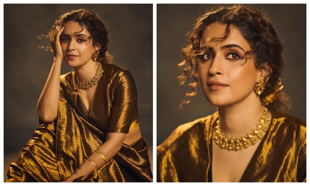सान्या मल्होत्रा ने गोल्डन कलर की मैटेलिक गोल्ड बनारसी साड़ी को सीधे पल्ले में ड्रेप किया. इस साड़ी लुक को उन्होंने गोल्ड स्टड्स के साथ पेयर किया. गोल्डन जूलरी सान्या के लुक में चार चांद लगा रही है.
