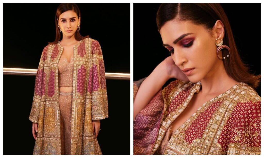 कृति सेनन का ये रॉयल लुक काफी हटके है. उन्होंने पेस्टल कलर के शरारा सेट को कलरफुल शेरवानी जैकेट के साथ पहना. साथ में मैचिंग मून डिजाइन इयररिंग्स पहने.