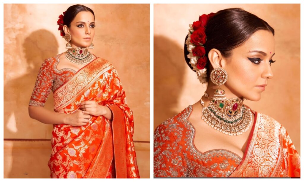 कंगना रनौत ऑरेंज कलर की बनारसी साड़ी में किसी अप्सरा से कम नहीं लग रही हैं. उन्होंने अपने ट्रेडिशनल साड़ी लुक को ट्रेडिशनल ओवरसाइज्ड झुमकी के साथ और खास बनाया.