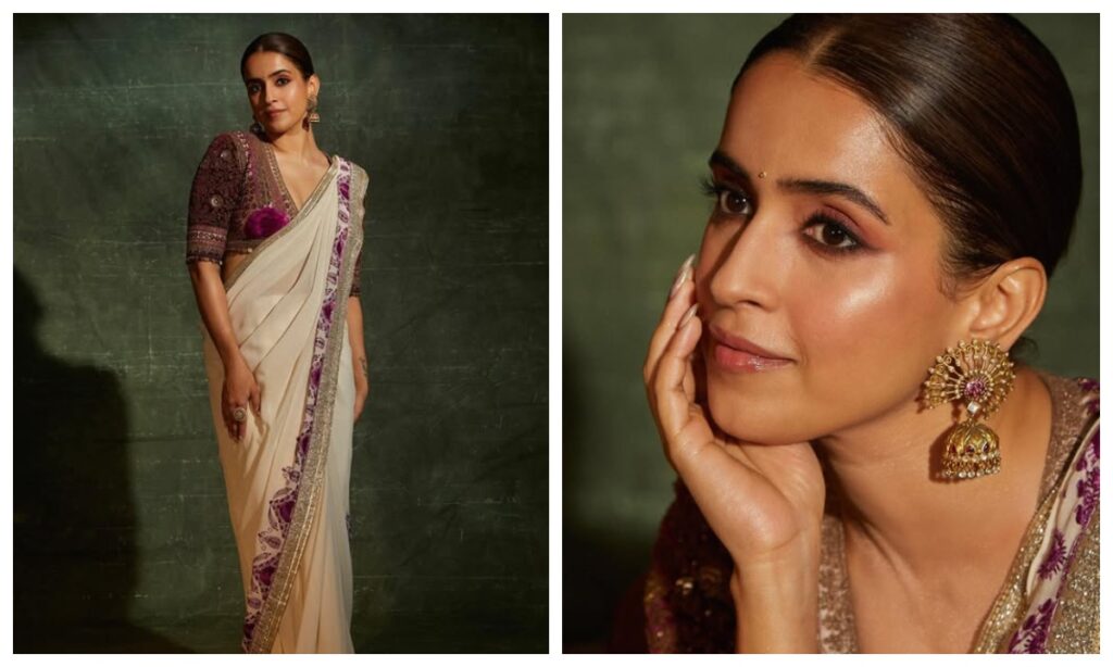 सान्या मल्होत्रा का ये साड़ी लुक गर्मियों के फंक्शन के लिए बढ़िया ऑप्शन है. उन्होंने अपने स्लीक एलिगेंट लुक को स्टेटमेंट झुमकी के साथ पूरा किया.