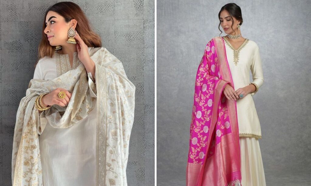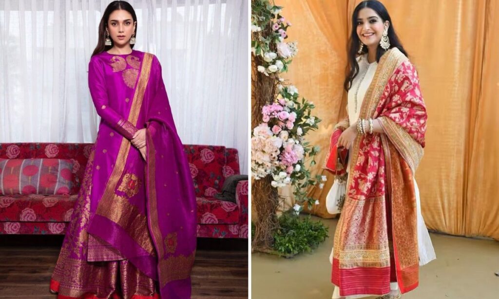 बनारसी दुपट्टे हर शादी की शान होते हैं. ये दुपट्टे अपने ज़री-बूटी और सिल्क के फैब्रिक के लिए जाने जाते हैं. खासतौर पर अगर आप मिनिमल आउटफिट पहन रही हैं, तो बनारसी दुपट्टा उसे तुरंत ग्रैंड और फेस्टिव बना देगा. ये फंक्शन के दिन पहनने के लिए एकदम परफेक्ट चॉइस है.