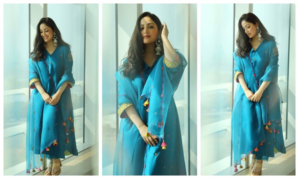 यामी गौतम ब्लू कलर के कुर्ता सेट में बहुत ही खूबसूरत लग रही हैं. आप भी इस वेडिंग सीजन किसी भी फंक्शन में इस तरह का लुक ट्राई कर सकती हैं.