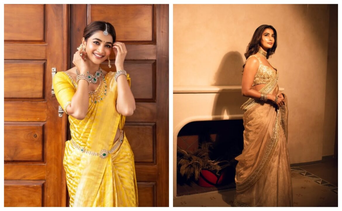 पीले रंग की बनारसी साड़ी में पूजा हेगड़े का लुक किसी का भी दिल जीत सकता है. डायमंड जूलरी और बालों में गजरा लगाकर एक्ट्रेस ने अपने ट्रेडिशनल लुक को पूरा किया.