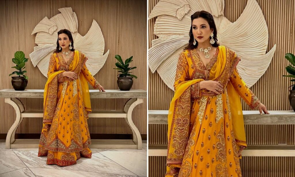 गौहर खान के इस येलो अनारकली सूट में खूबसूरत कढ़ाई और ट्रेडिशनल जूलरी है जो हर किसी का ध्यान खींच लेती है. उन्होंने इसे ट्विस्टेड हेयरस्टाइल और बोल्ड लिपस्टिक के साथ पहना है. यह लुक आपको किसी भी ईद पार्टी में स्टार बना देगा.