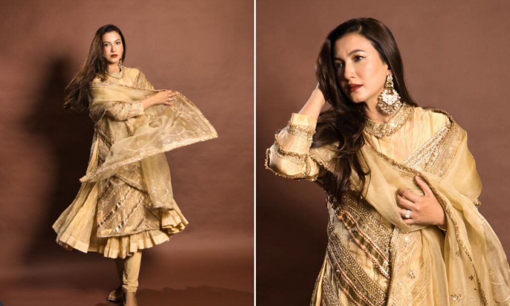गौहर खान का यह डबल लेयर्ड गोल्डन कुर्ता सेट ऑर्गेन्ज़ा दुपट्टे और मैचिंग पायजामे के साथ बेहद ग्रेसफुल लगता है. उन्होंने इसे गोल्डन आईशैडो और रेड लिप्स के साथ स्टाइल किया है, जो लुक को और भी खास बना देता है. ये लुक खासकर ईद की रात के लिए एकदम फिट है.