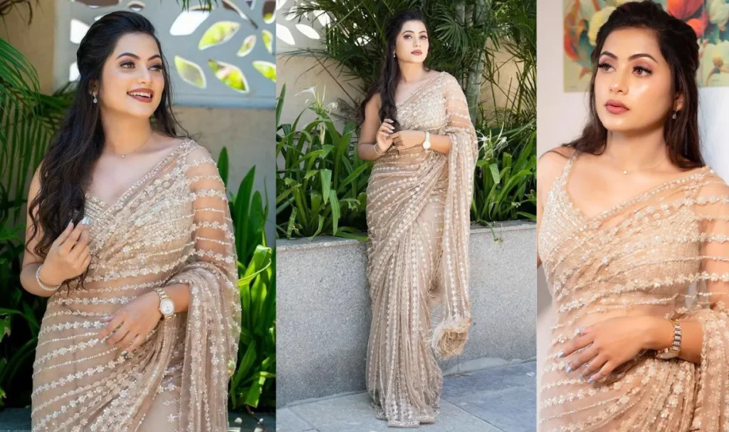 गोल्डन कलर की यह शिमर वाली साड़ी बहुत ही खूबसूरत लग रही है. इस पर मोतियों से छोटे-छोटे फूलों की डिटेलिंग की गई है. इस तरह की साड़ी आपको ऑनलाइन आसानी से मिल जाएगी. इस लुक के साथ मिनिमल ज्वैलरी ही पहनें और मिनिमल मेकअप करवाएं. ये साड़ी आपको क्लासी स्टाइलिश लुक देगी.