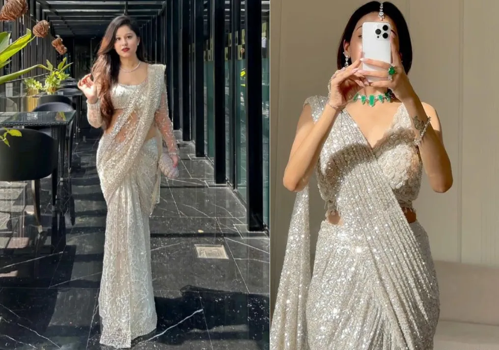 यह सिल्वर कलर की साड़ी बिल्कुल रानी जैसी फीलिंग दे रही है. साड़ी के दोनों स्टाइल बहुत सुंदर हैं. आप फुल स्लीव्स या स्लीवलेस ब्लाउज बनवा सकती हैं. इसके साथ ग्रीन एमराल्ड नेकलेस आपके लुक में आउटशाइन करेगा. इसके साथ एक सुंदर सा क्लच पर्स लेना न भूलें.
