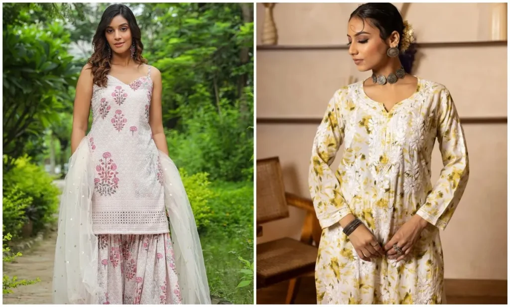चिकनकारी कुर्ता सेट हर मौके पर बेस्ट लगता है. इन सूटों पर फ्लोरल एंब्रॉयडरी का मिक्स आपके आउटफिट में ट्रेडिशनल और मॉडर्न का टच देती है. आप दिन के फंक्शन या फिर ऑफिस मीटिंग के लिए भी इस तरह का लुक कैरी कर सकती हैं.