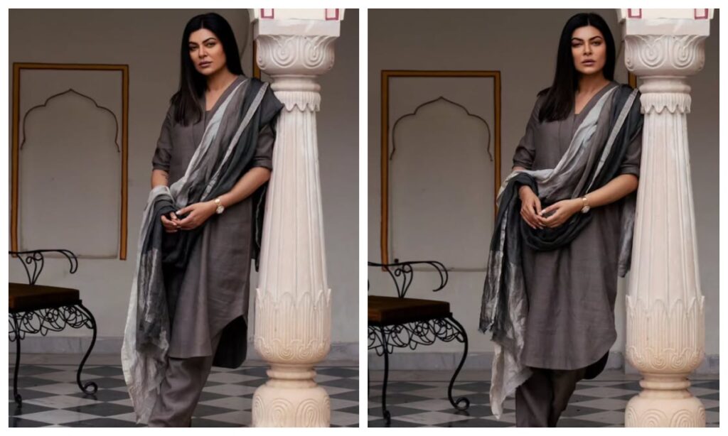 एक्ट्रेस सुष्मिता सेन का ये सूट लुक काफी केजुअल और स्टाइलिश है. उन्होंने चारकोल कलर के कुर्ता सेट को डबल टोन दुपट्टे के साथ कैरी किया. आप भी इस लुक को ट्राई कर सकती हैं.
