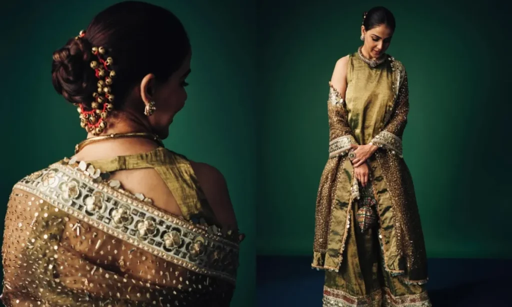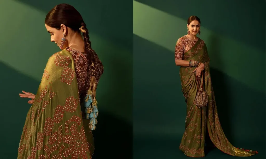 साड़ी में जेनेलिया देशमुख की खूबसूरती और निखर जाती है. यहां वो ग्रीन कलर की बांधनी साड़ी में परफेक्ट फंक्शन वाइब देती हुई दिखीं. जेनेलिया ने ब्लाउज से मैच होता पोटली बैग भी कैरी किया था. एंटीक इयररिंग और कंगन के साथ अपने साड़ी लुक को स्टाइल किया. इसके अलावा उन्होंने अपने बालों को परादा लगाकर अलग लुक दिया.