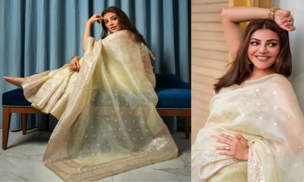काजल अग्रवाल की यह ऑर्गेंजा येलो-गोल्डन साड़ी भी बहुत प्यारी लग रही है. ऑर्गेंजा साड़ी स्लिम लड़कियों के लिए बेस्ट हैं, यह उनमें वॉल्युम ऐड करता है. इस साड़ी के साथ आप बन भी बना सकती हैं और खुले बाल भी स्टाइल कर सकती हैं. किसी भी लुक को परफेक्ट बनाने के लिए सिंपल मेकअप जरूर करें.