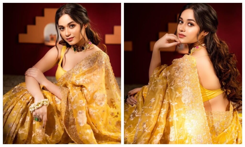 ऑर्गेंजा सिल्क साड़ी में जन्नत जुबैर बला की खूबसूरत लग रही हैं. हल्दी से लेकर आप किसी भी बड़े फंक्शन में इस तरह की साड़ी पहनकर जा सकती हैं.