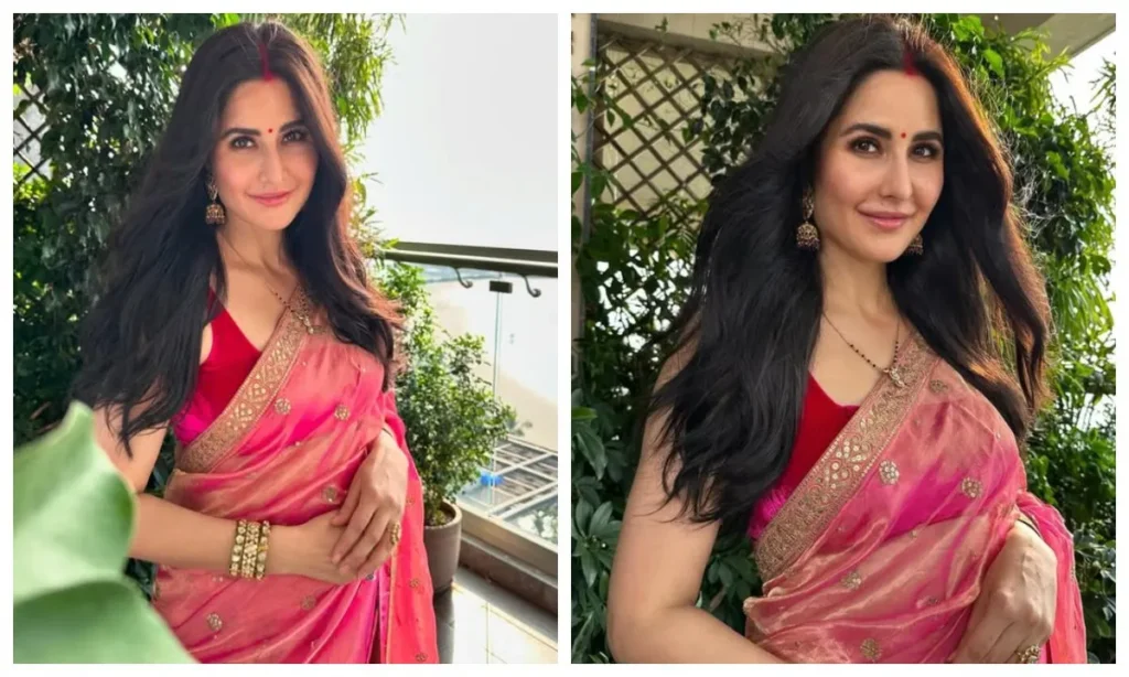 कैटरीना ने पिछले साल करवा चौथ पर पेस्टल पिंक कलर की साड़ी पहनी थी, जिस पर सिल्वर जरी का काम था. साड़ी के बॉर्डर पर की गई कढ़ाई ने इसे और भी रिच लुक दिया. उन्होंने इस साड़ी के साथ मैचिंग ब्लाउज़ पहना, जिसमें डीप बैक कट और मिनिमल गोटा-पट्टी डिटेलिंग थी.