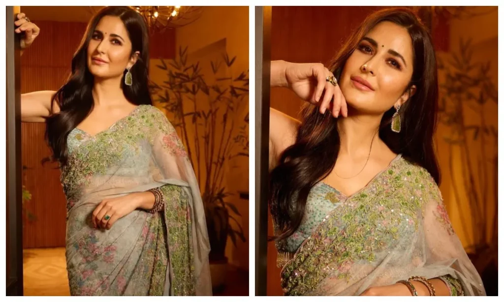 अगर आप करवा चौथ पर सिंपल लुक चाहती हैं, तो कैटरीना कैफ की तरह फ्लोरल ग्रीन साड़ी भी पहन सकती हैं. उन्होंने इस साड़ी को मैचिंग स्लीवलेस ब्लाउज के साथ कैरी किया था. मिनिमल मेकअप और जूलरी के साथ उन्होंने अपने साड़ी लुक को कम्पलीट किया.