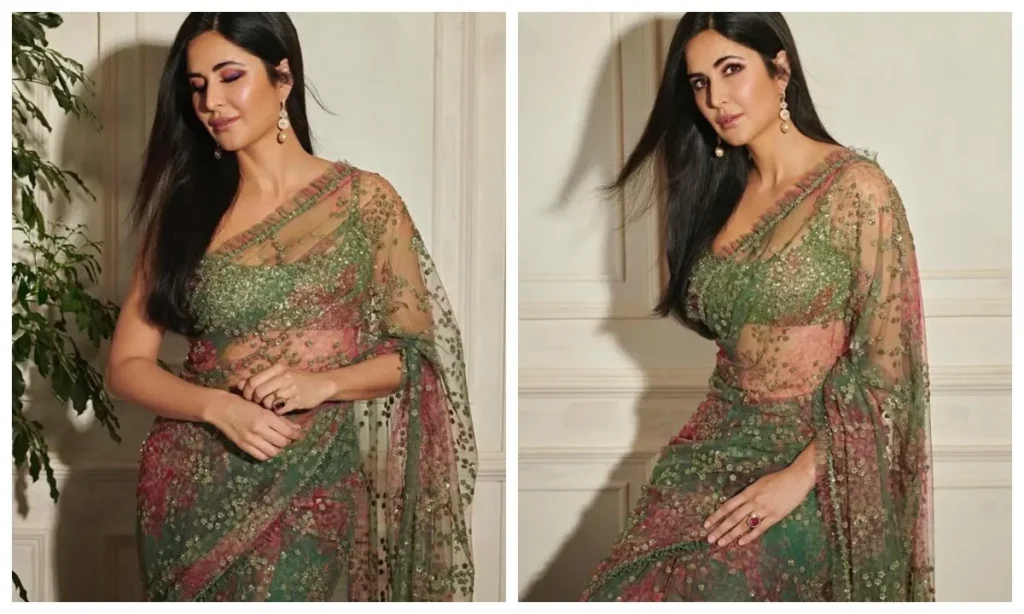 करवा चौथ के लिए कैटरीना कैफ का ये साड़ी लुक भी फैशन लवर्स के लिए इंस्पिरेशन है. अगर आप त्योहार के दिन कुछ यूनिक पहनना चाहती हैं, तो कैटरीना की तरह नेट साड़ी पहन सकती हैं. ये साड़ी आपके करवा चौथ को ग्लैमरस टच देगी.
