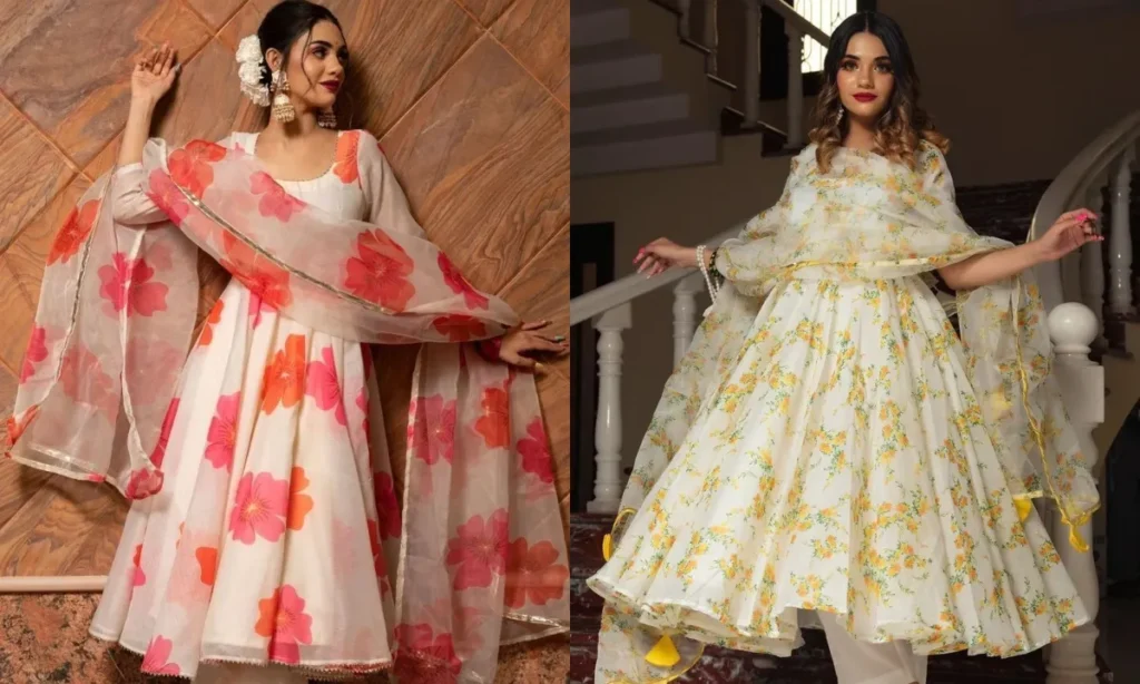 इन दिनों ऑर्गेन्ज़ा फैब्रिक काफी ज्यादा ट्रेंड में है. बड़े-बड़े फूलों के प्रिंट वाले ऑर्गेन्ज़ा अनारकली सूट्स ना सिर्फ लाइटवेट होते हैं, बल्कि देखने में बहुत प्रीमियम लुक भी देते हैं. इस तरह के सूटों को आप डे-इवेंट्स या समर वेडिंग्स में पहन सकती हैं. एक छोटी सी बिंदी और खुले बालों के साथ ये लुक आपको एकदम रिफ्रेशिंग दिखाएगा.