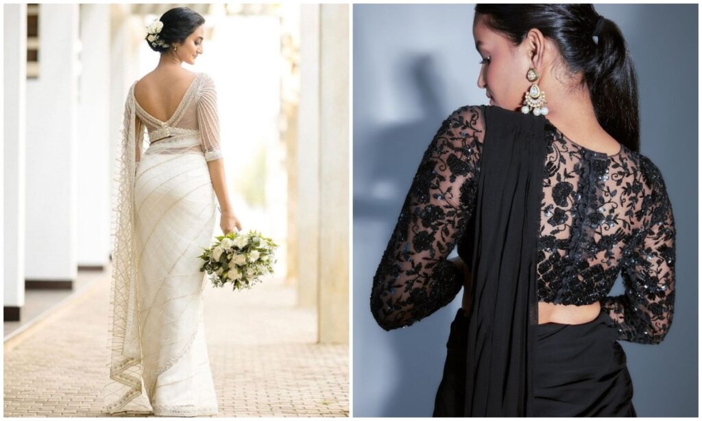 अगर आप साड़ी को ग्लैमरस टच देना चाहती हैं, तो नेट फैब्रिक वाला बैक ब्लाउज डिज़ाइन आपके लिए बिल्कुल परफेक्ट रहेगा. इसमें स्टोन या सेक्विन वर्क ऐड करके आप स्टाइल को और बढ़ा सकती हैं.