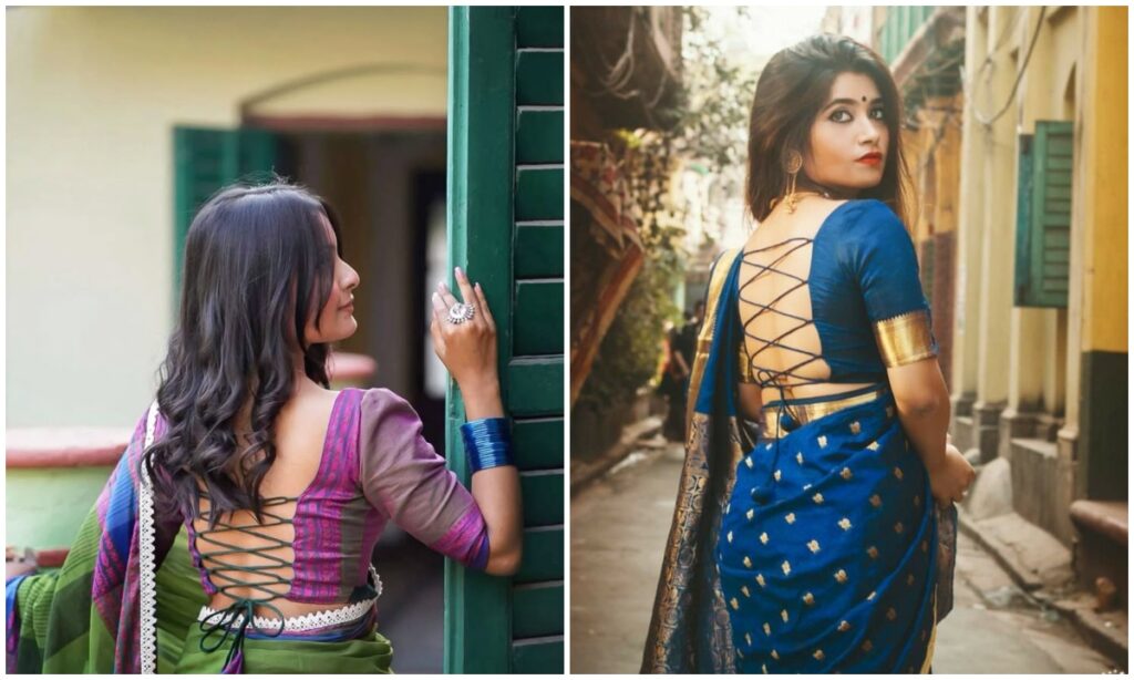 यंग लड़कियों के बीच क्रिस क्रॉस बैक ब्लाउज डिजाइन काफी ट्रेंड में है. क्रिस-क्रॉस स्ट्रैप्स वाला स्टाइल, बैक को बोल्ड और स्टेटमेंट लुक देता है. इसे सिंपल साड़ियों के साथ पहनें और पार्टी में सेंटर ऑफ अट्रैक्शन बन जाएं.