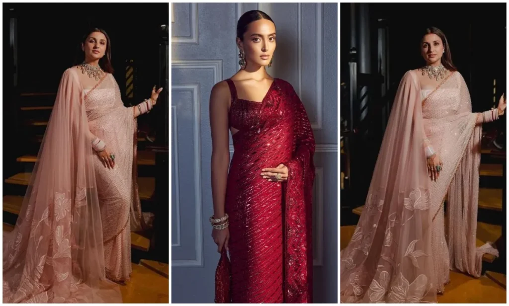 मनीष मल्होत्रा के नए कलेक्शन में सीक्वेंस साड़ी भी है, जो हर दुल्हन के लिए परफेक्ट है. इस साड़ी में रिच कलर्स और गोल्डन बॉर्डर देखने को मिल रहा है. आप भी इस तरह की रॉयल साड़ी में ग्लैमरस दिख सकती हैं.