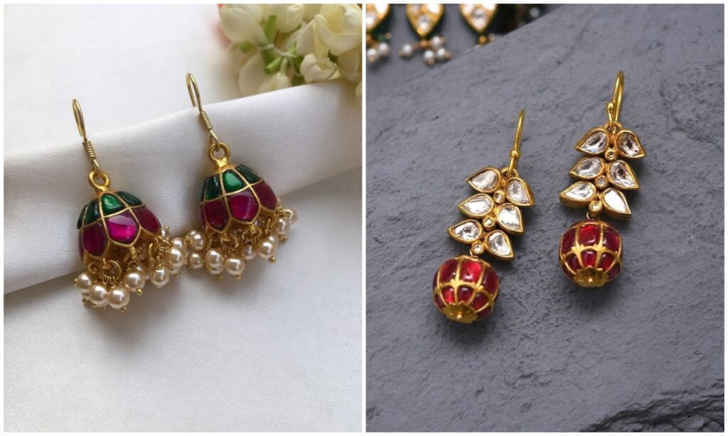 गोल्ड बेस पर कुंदन या कलरफुल स्टोन से बने ये फ्लोरल डिजाइन वाले झुमके स्टाइलिश और फेमिनिन लुक के लिए बेस्ट हैं. कम वजन की वजह है ये काफी कंफर्टेबल भी रहते हैं. आप इन्हें किसी भी तरह के आउटफिट के साथ कैरी कर सकती हैं.