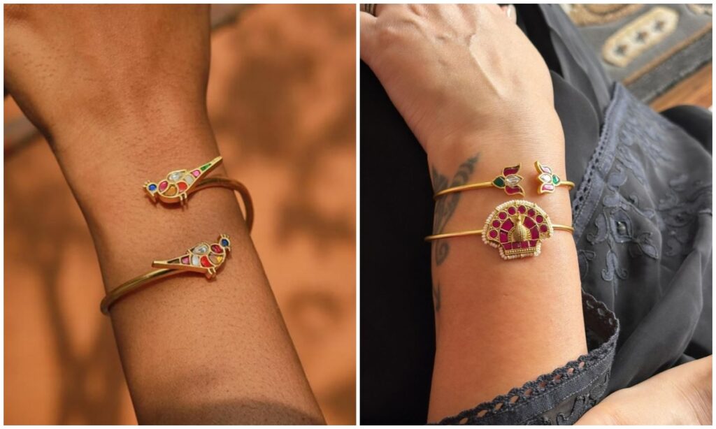 गोल्डन बेस पर जड़ाऊ स्टाइल में बना ये यूनीक ब्रेसलेट काफी क्लासी टच देता है. इस ब्रेसलेट कम कड़े को आप भारी कंगन की जगह पहन सकती हैं. आप इसे पार्टी वियर साड़ी या फिर लहंगे के साथ कैरी करेंगी, तो और हसीन लगेंगी.