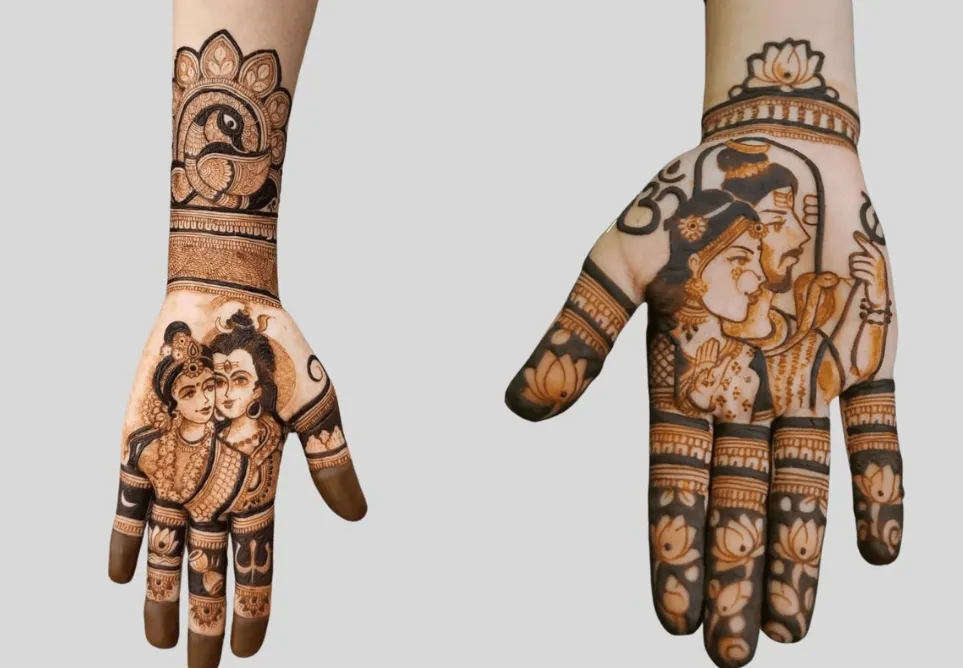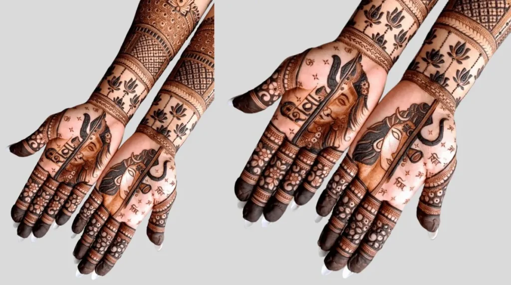 अगर आप नई नवेली दुल्हन हैं तो आपके लिए यह डिजाइन बेस्ट होगा. त्रिशूल, शिव-पार्वती और कमल के फूलों से बना यह डिजाइन दुल्हनों पर बहुत सुंदर लगेगा. इस डिजाइन से आपके हाथ खिल उठेंगे. आप चाहें तो एक हाथ में त्रिशूल बनाकर दूसरे हाथ शिव-पार्वती का चेहरा भी बना सकती हैं या फिर कुछ और क्रिएटिविटी कर सकती हैं.