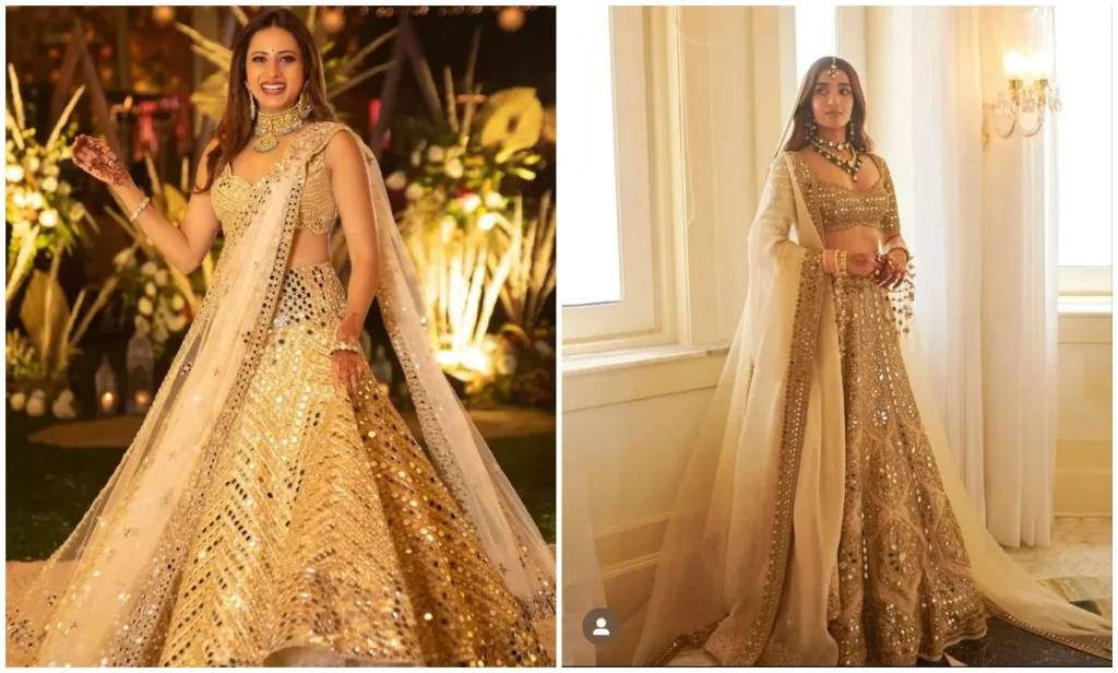 अगर आप चाहती हैं कि वेडिंग फंक्शन में आपको परफेक्ट रॉयल लुक मिले, तो गोल्डन मिरर वर्क वाला लहंगा एक बेहतरीन चॉइस है. स्टेटमेंट जूलरी और लाइट मेकअप आपके लुक को परफेक्ट बना देगा.
