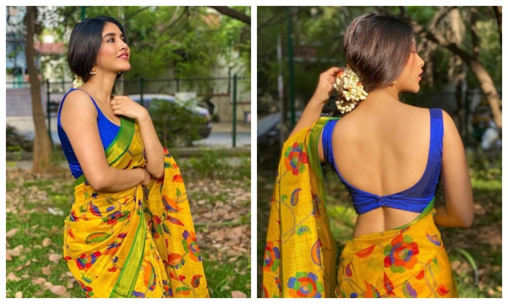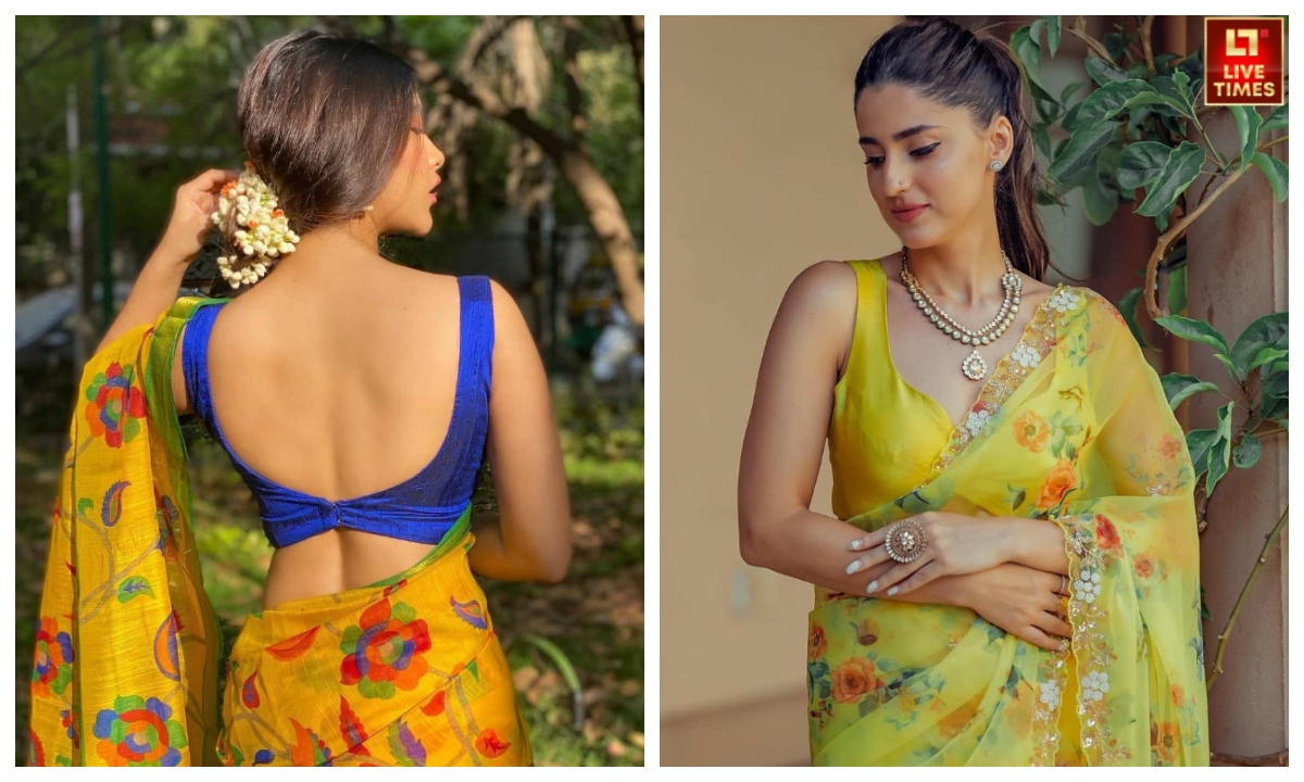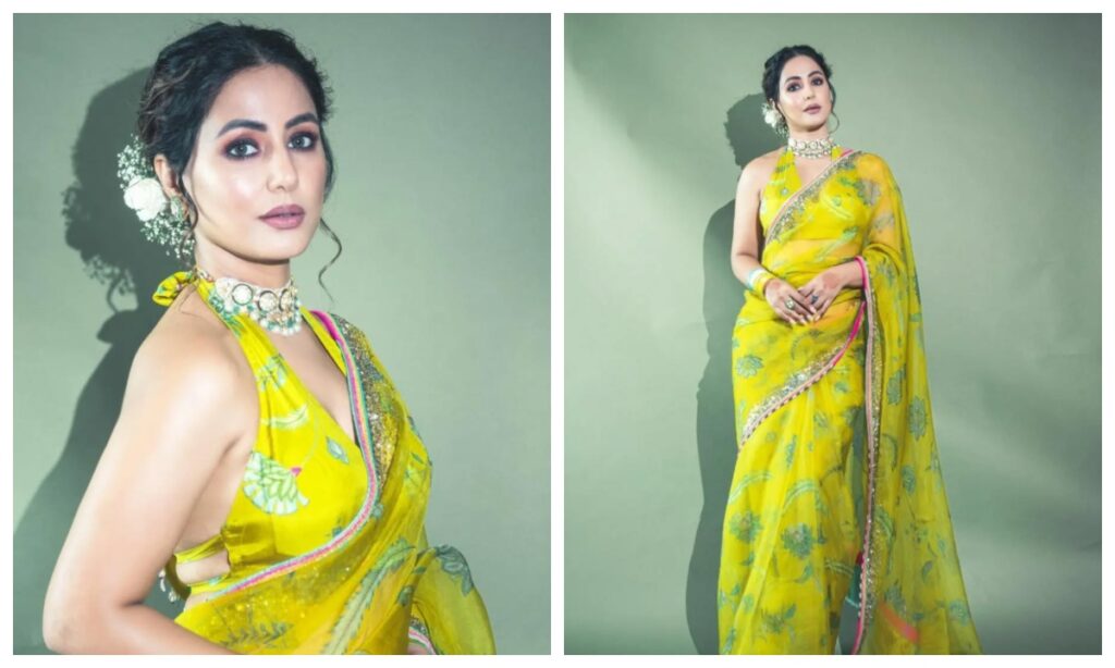 अगर आपको बोल्ड साड़ी लुक पसंद है तो फिर हिना खान को देखें. उन्होंने अपनी पीले रंग की प्रिंटेड साड़ी को मैचिंग हॉल्टर ब्लाउज के साथ पेयर किया था.