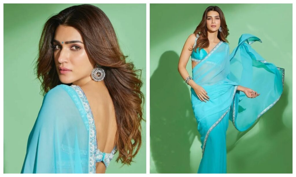 कृति सेनन फिरोज़ी कलर की शिफॉन साड़ी में बहुत खूबसूरत लग रही हैं. उन्होंने इस लाइटवेट साड़ी को मैंचिग रंग के पैडेड ब्लाउज के साथ पहना.