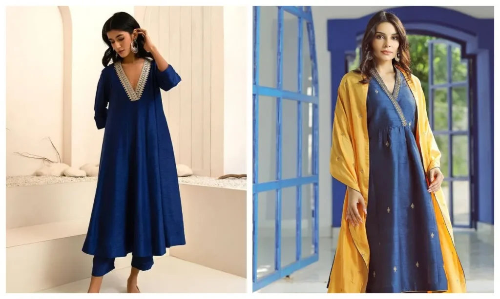 नेवी ब्लू सिल्क कुर्ती पर गोटा पट्टी वर्क बहुत शानदार लगता है. आप इसे कॉन्ट्रास्ट दुपट्टे के साथ कैरी कर सकती हैं. फेस्टिव लुक को रिच फील देने के लिए आप भी इस तरह का कुर्ता सेट ट्राई कर सकती हैं. इसके अलावा ये लुक रात के फंक्शन या संगीत के लिए भी परफेक्ट है.