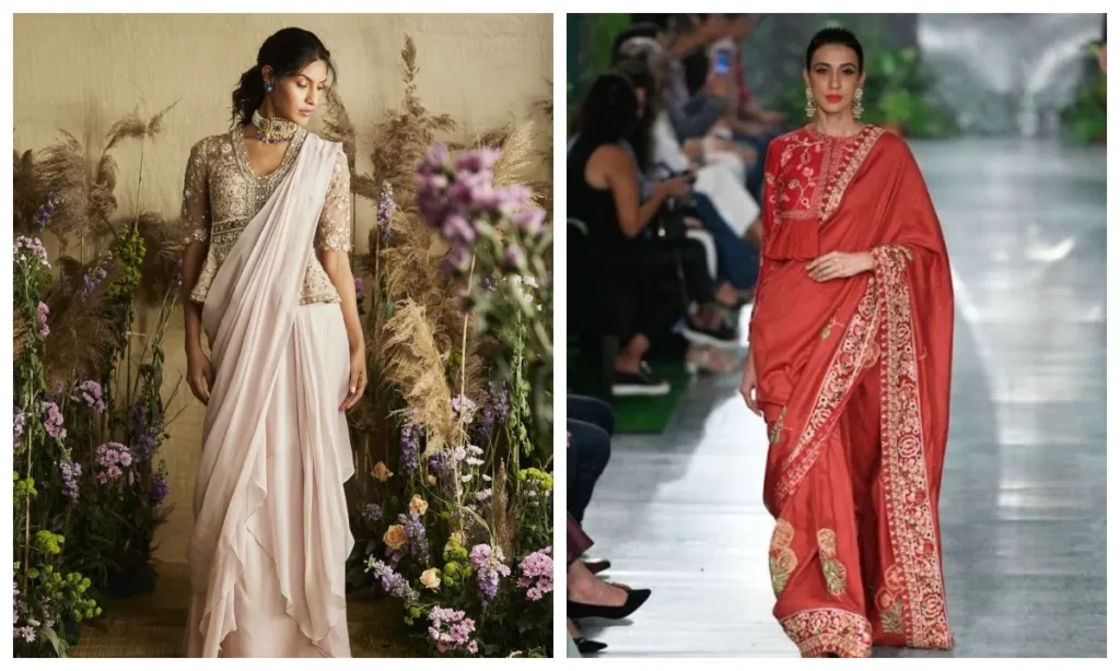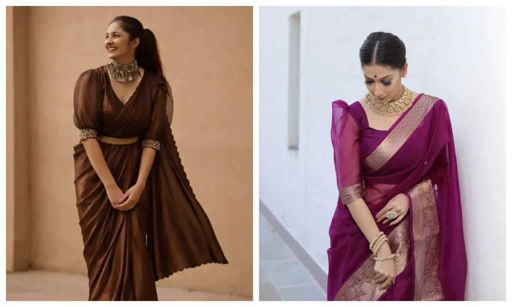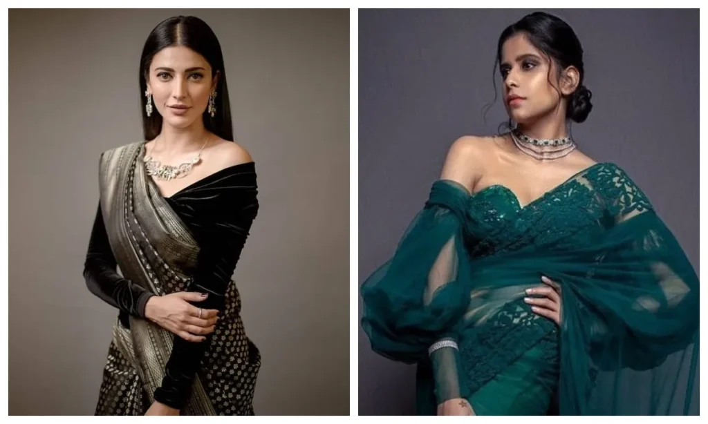 अगर आप पार्टी या संगीत नाइट के लिए कुछ बोल्ड और नया ढूंढ रही हैं, तो ऑफ-शोल्डर ब्लाउज सबसे अच्छा ऑप्शन है. ये क्लीन और यंग लुक देता है जिसे स्टेटमेंट जूलरी के साथ और भी शानदार बनाया जा सकता है.