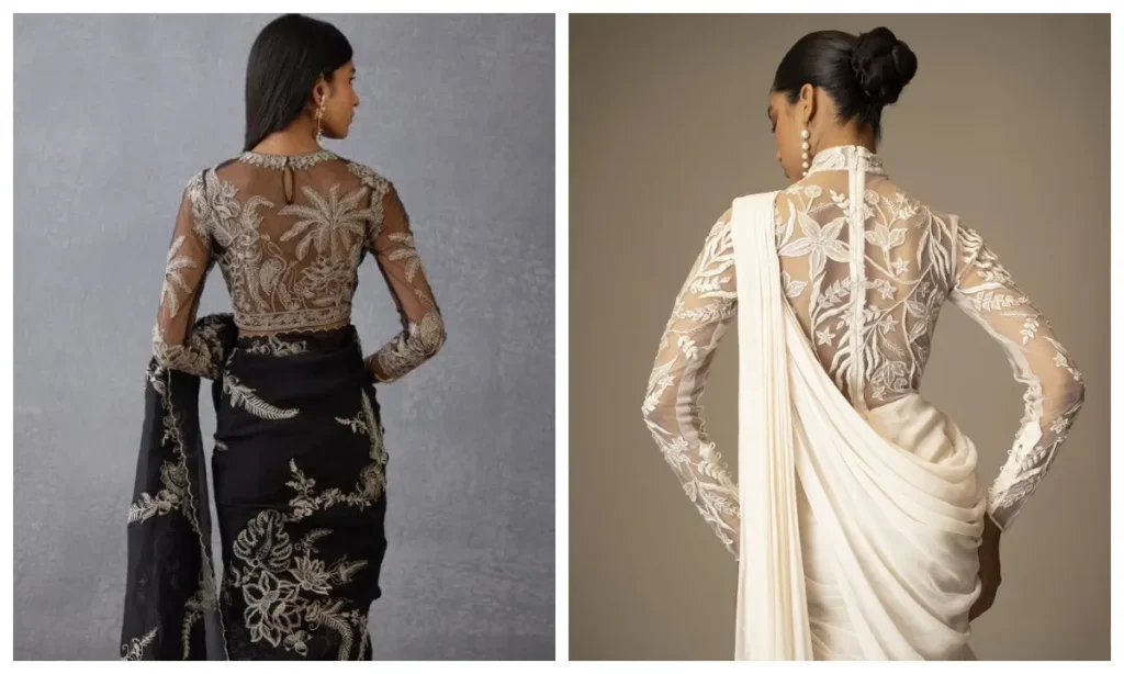 बैक डिजाइन में आजकल नेट का इस्तेमाल काफी ज्यादा पसंद किया जा रहा है. एम्ब्रॉयडरी वाली नेट आपके ब्लाउज की बैक को बहुत ही स्टाइलिश दिखाती है. किसी भी फंक्शन के लिए ये लुक परफेक्ट है.