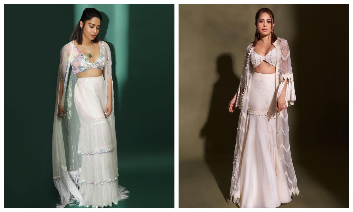 नुसरत इस ऑफव्हाइट शरारा लहंगे में हुस्न का जलवा बिखेर रही हैं. सेक्विन बॉर्डर वाले इस शरारे के साथ उन्होंने हैवी मैचिंग चोली और श्रग पेयर किया. वहीं, सिल्वर-ग्रीन नेकपीस, मैचिंग स्टड ईयररिंग्स, न्यूड शेड लिपस्टिक, सटल मेकअप और हाफ टाई स्ट्रेट हेयर स्टाइल ने एक्ट्रेस के लुक को पूरा किया.