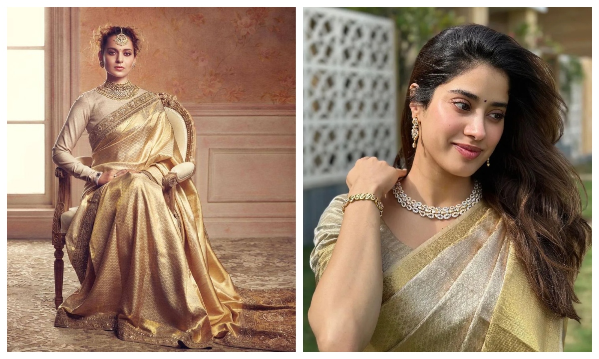 मंडी की सांसद कंगना रनौत इस गोल्डन सिल्क साड़ी में कमाल दिख रही हैं. गोल्डन बॉर्डर वाली यह साड़ी ओणम पर्व के लिए एकदम परफेक्ट च्वाइस है. इस शाइनी साड़ी को आप हैवी गोल्डन ज्वेलरी और मैसी हेयर बन के साथ स्टाइल कर सकती हैं.