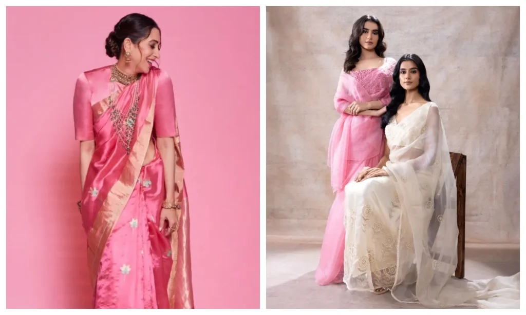 - टिशू ऑर्गेंजा: धूप में शाइन करने वाली ये साड़ी दिन के फंक्शन के लिए बेहतरीन है. इसे वेलवेट ब्लाउज के साथ पेयर करके आप ट्रेडिशन और मॉडर्न लुक का बैलेंस बना सकती हैं.
