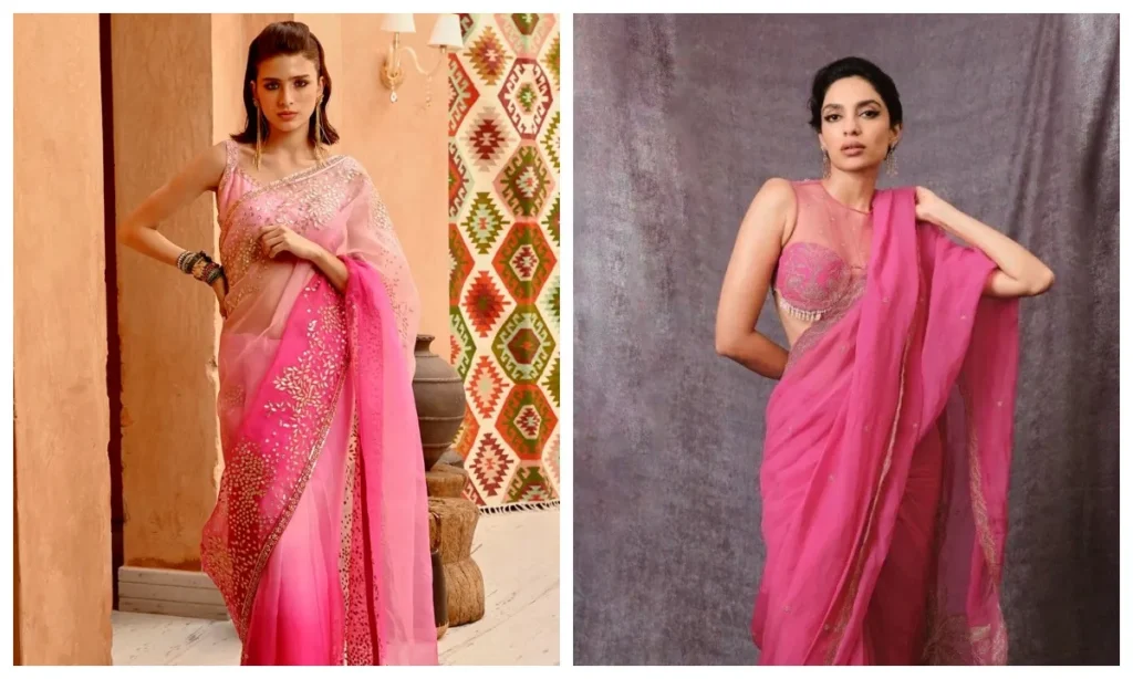 लाइट ब्लश पिंक शेड में ऑर्गेंज़ा साड़ी उन लड़कियों के लिए परफेक्ट है जो मिनिमल लुक पसंद करती हैं. सॉफ्ट फ्लोरल प्रिंट और सीक्विन बॉर्डर वाली ये साड़ियां दिन के फंक्शन या आउटडोर ब्रंच के लिए बेस्ट चॉइस है.