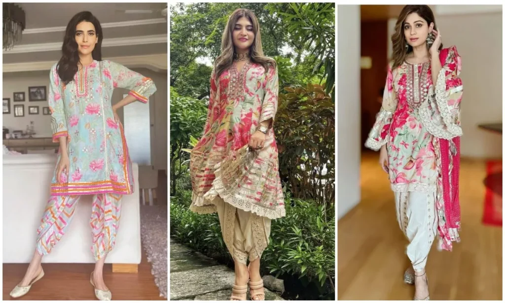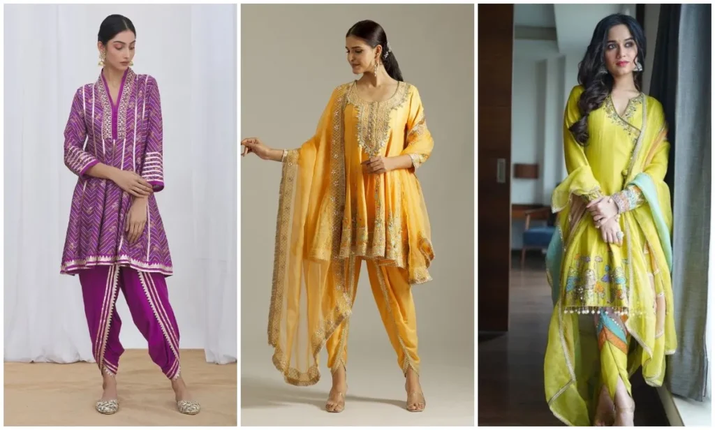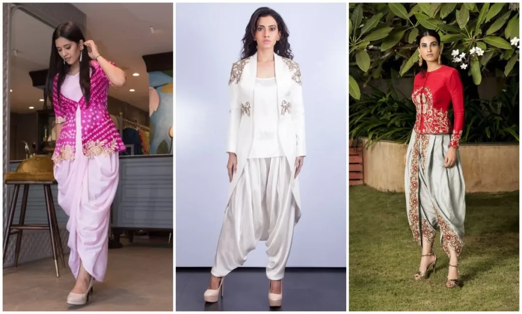 शानदार सूट सेट जिसमें धोती, सलवार और स्टाइलिश कुर्ते के साथ साथ मैचिंग जैकेट भी शामिल होती है. इस तरह के सूट पहनकर कोई भी लड़की आसानी से अपनी एलीगेंट पर्सनैलिटी को फ्लॉन्ट कर सकती है. ये डिज़ाइन खास तौर पर त्योहारों के लिए बेस्ट है.