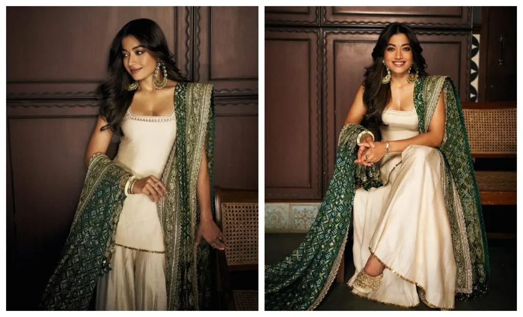 रश्मिका जब आइवरी कलर के सूट में सामने आईं, तो सबकी निगाहें उन पर ठहर गईं. इसके साथ उन्होंने डार्क ग्रीन कलर का हैवी कढ़ाई वाला दुपट्टा कैरी किया था. बड़े-बड़े इयररिंग्स ने उन्हें किसी मॉडर्न राजकुमारी जैसा लुक दिया. ये सादगी और रॉयल्टी का एक परफेक्ट एग्जाम्पल था.