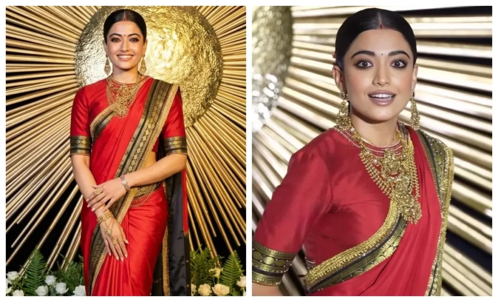 साड़ी में रश्मिका की खूबसूरती का कोई मुकाबला नहीं है. जब उन्होंने सिल्क की ब्रोंज साड़ी पहनी, तो वो बिल्कुल किसी शाइनिंग स्टार जैसी लग रही थीं. साड़ी की हल्की चमक, बारीक बॉर्डर और उनके खुले लहराते बाल, ये पूरा लुक काफी मॉडर्न और सोफिस्टिकेटेड था.