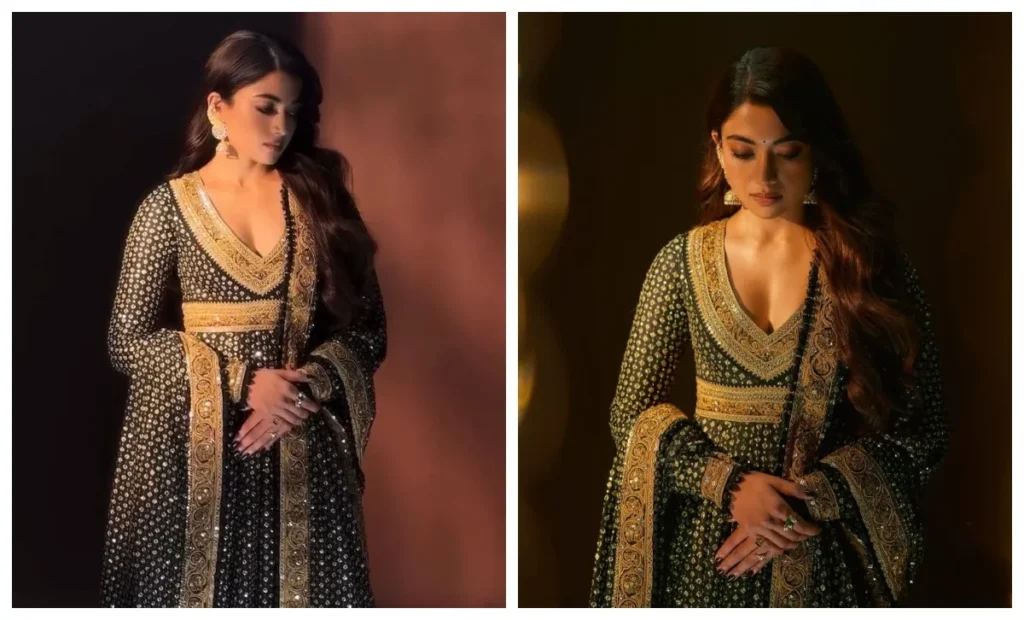 ब्लैक सीक्विन अनारकली सूट में रश्मिका मंदाना किसी अप्सरा से कम नहीं लग रही थीं. उन्होंने ट्रेडिशनल झुमकी, साइड पार्टेड ओपन हेयर और सिंपल मेकअप के साथ अपने इस ट्रेडिशनल लुक को और स्टनिंग बनाया.