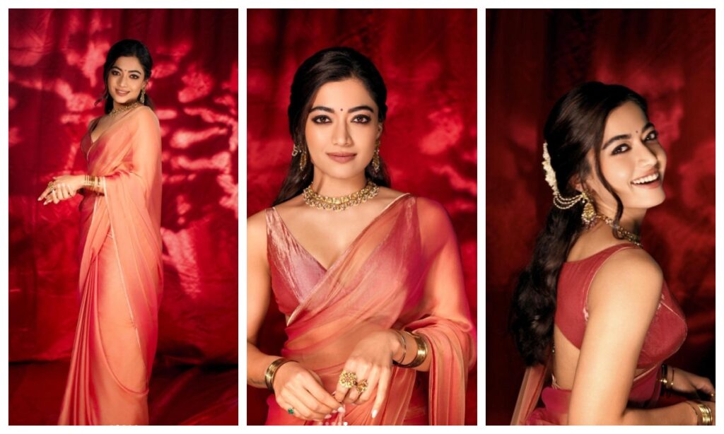 टिश्यू साड़ियां कर्वी फिगर पर बहुत अच्छी लगती हैं. यहां रश्मिका मंदाना भी पेस्टल कलर की टिश्यू साड़ी में अपने कर्वी फिगर को बड़ी ही खूबसूरती से फ्लॉन्ट कर रही हैं.