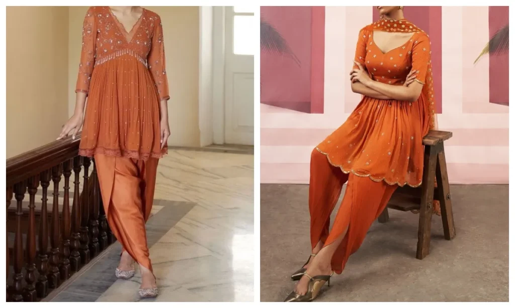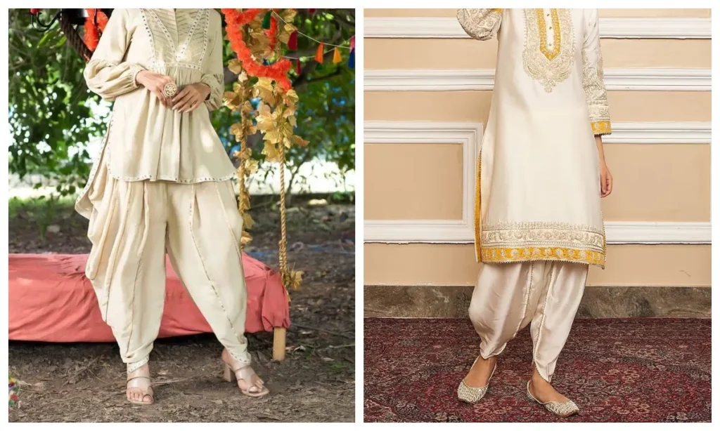 अगर आप अपनी कुर्ती को थोड़ा मॉडर्न और फ्यूजन टच देना चाहती हैं, तो धोती सलवार सबसे बेस्ट है. इसमें कई सारी लेयर्स होती हैं जो चलते टाइम काफी ग्रेसफुल लुक देती है. इसे शॉर्ट कुर्ती या पेपलम टॉप के साथ भी आसानी से पेयर किया जा सकता है.