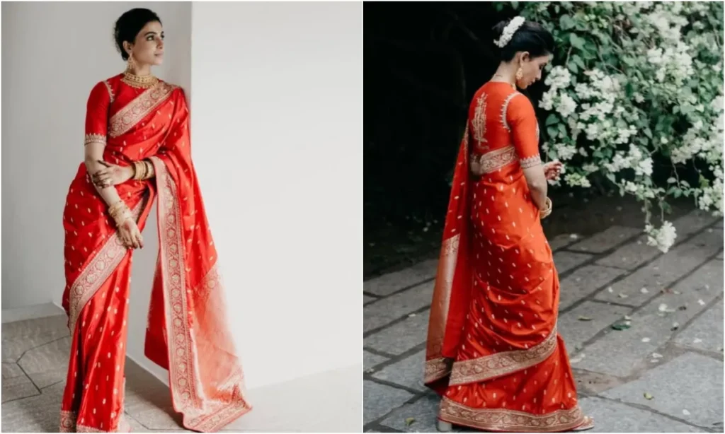 Samantha wedding look: साउथ स्टार सामंथा रुथ प्रभु हमेशा से अपनी सादगी और ग्रेस के लिए जानी जाती रही हैं. 1 दिसंबर, 2025 का उनका ब्राइडल लुक इस बात का सबसे खूबसूरत सबूत है. कोयंबटूर के ईशा योग सेंटर के लिंग भैरवी मंदिर में फिल्ममेकर राज निदिमोरू के साथ हुई उनकी शादी के बारे में हर कोई बात कर रहा है. दोनों की शादी बहुत ही शांत, प्राइवेट और खूबसूरत माहौल में हुई. हालांकि, पूरे प्रोग्राम में सबसे ज्यादा चर्चा में रही सामंथा की हैंडवोवन बनारसी साड़ी. उनकी ब्राइडल साड़ी बहुत ही सिंपल, लेकिन बारीक और शानदार इंडियन ऑर्ट से भरी हुई थी.