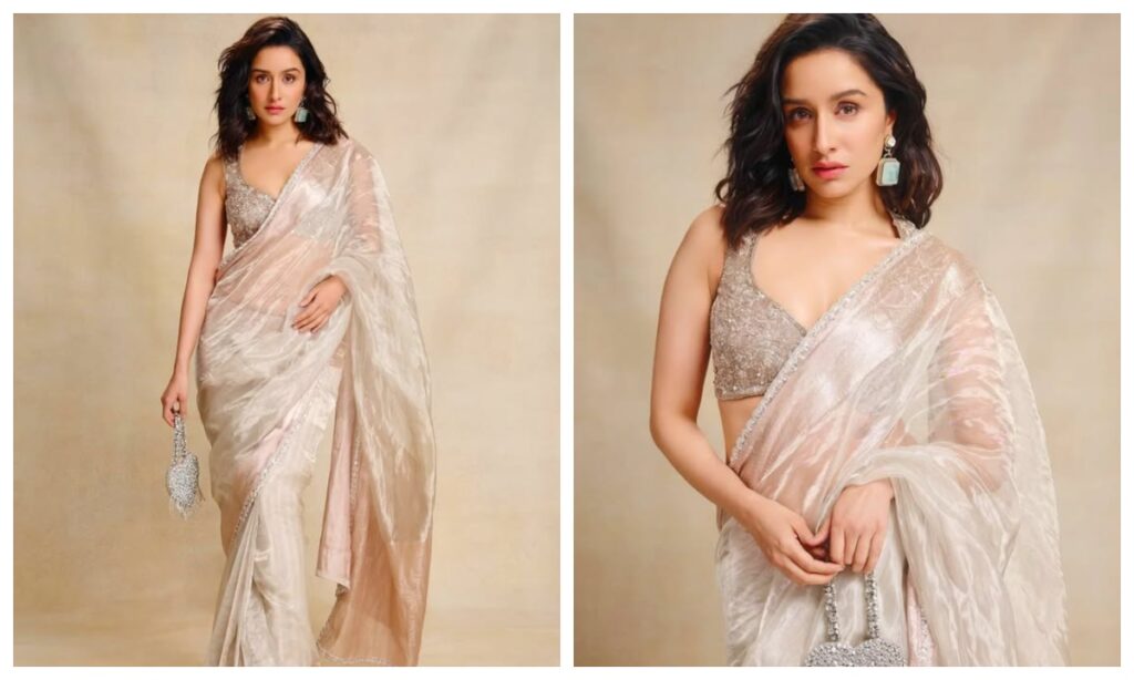 व्हाइट कलर की ट्रांसपेरेंट टिश्यू साड़ी में श्रद्धा कपूर बहुत ही प्यारी लग रही हैं. हॉर्ट शेप का पोटली बैग, मैसी हेयर, स्टेटमेंट इयररिंग्स और मिनिमल मेकअप के साथ उन्होंने अपना साड़ी लुक कम्पलीट किया.