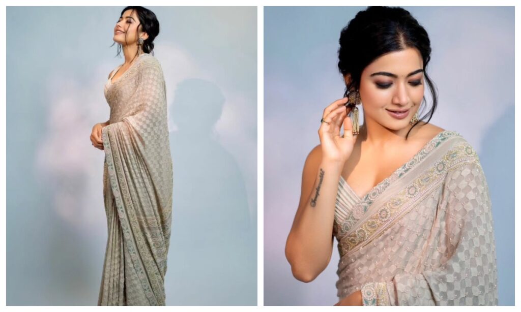 आइवरी कलर की चंदेरी साड़ी पहनकर रश्मिका मंदाना ने अपनी फिल्म पुष्पा 2 का प्रमोशन किया था. एलिगेंट लुक के लिए आप भी इस तरह की एक साड़ी खरीद सकती हैं.
